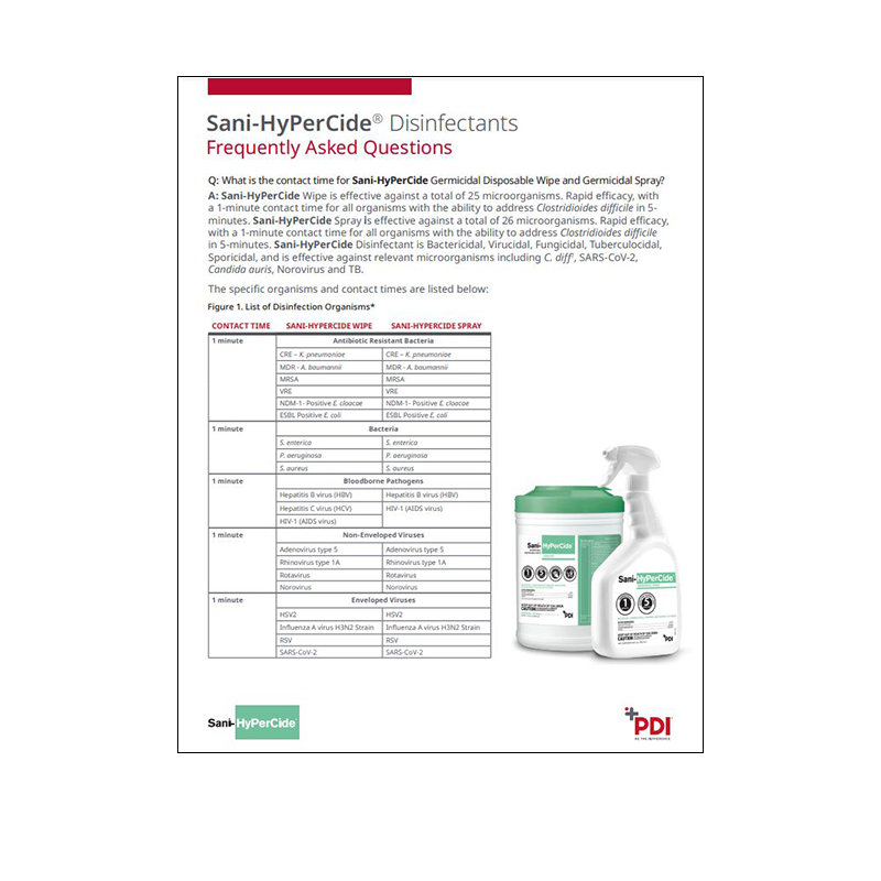 With Sani-HyPerCide® Germicidal Disposable Wipe, you have the power to protect your patients, equipment, and healthcare environment. Sani-HyPerCide disinfectant is a powerful, ready-to-use hydrogen peroxide formula designed to address HAI-causing microorganisms, including Clostridioides difficile without compromising compatibility. Have questions? Download our frequently asked questions resource for more information.