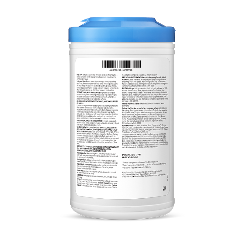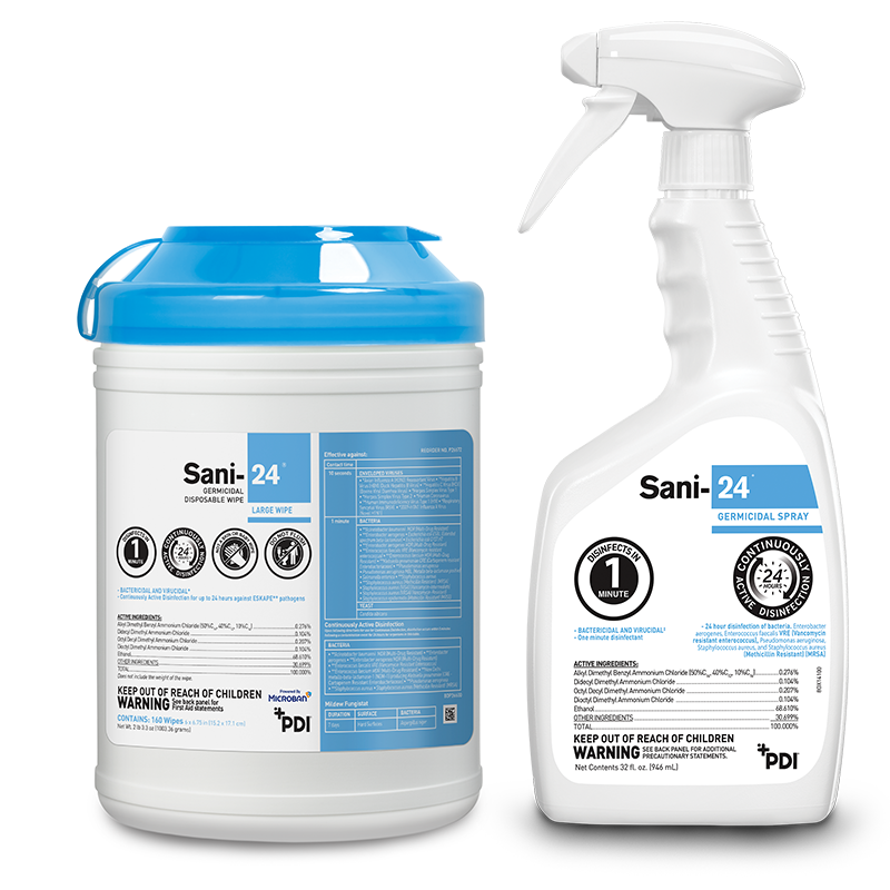 All of PDI’s Sani-Cloth® brand products are EPA-Registered. Sani-HyPerCide® Germicidal Disposable Spray (EPA reg number 9480-14), Sani-HyPerCide® Germicidal Wipes (EPA reg number 9480-16), Sani-24® Germicidal Spray (EPA reg number 42182-9-9480), Sani-24® Germicidal Wipes (EPA reg number 42182-13-9480), Sani-Cloth® Prime Germicidal Disposable Wipes (EPA reg number 9480-12), Sani-Prime™ Germicidal Spray (EPA reg number 9480-10), Sani-Cloth® AF3 Germicidal Disposable Wipes (EPA reg number 9480-9), Super Sani-Cloth® Germicidal Disposable Wipes (EPA reg number 9480-4) and Sani-Cloth® Bleach Germicidal Disposable Wipes (EPA reg number 9480-8) have an efficacy claim against Mycobacterium bovis (i.e. Tuberculosis), qualifying these products as intermediate-level disinfectants. Each product exceeds the CDC’s recommendations for cleaning and disinfection in healthcare facilities. Sani-Cloth® Plus wipes (EPA reg number 9480-6) and Sani-Cloth® HB wipes (EPA reg number 61178-4-9480) do not have an efficacy claim against Mycobacterium bovis, which classifies these products as low-level disinfectants.