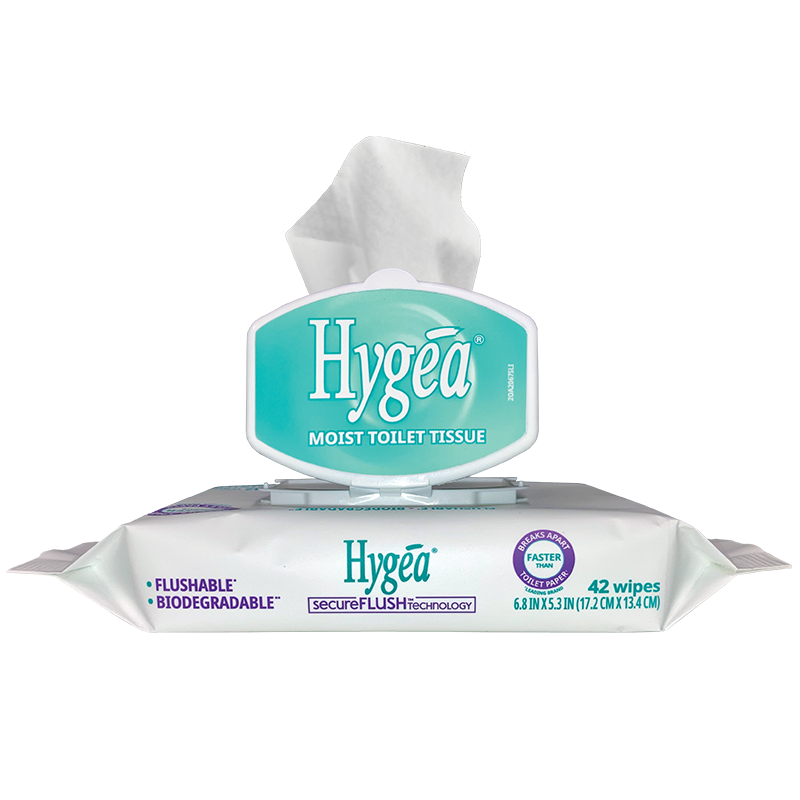 Hygea® Moist Toilet Tissue is a 100% biodegradable flushable wipe that cleans and refreshes better than dry toilet paper, and is safe for well-maintained sewer and septic systems!*