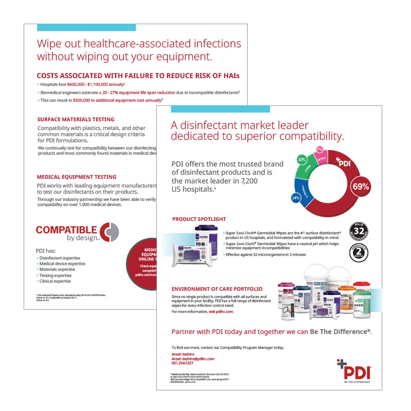 Compatibility with plastics, metals, and other common materials is a critical design criteria for PDI formulations. We continually test for compatibility between our disinfecting products and most commonly found materials in medical devices. PDI works with leading equipment manufacturers to test our disinfectants on their products. Through our industry partnerships we have been able to verify compatibility on over 1,000 medical devices.