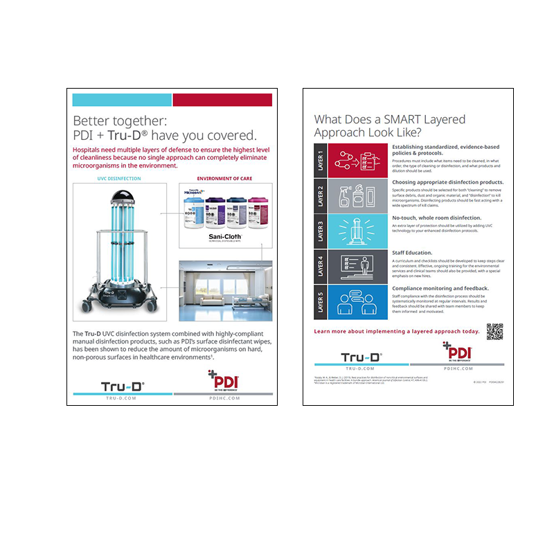 Hospitals need multiple layers of defense to ensure the highest level of cleanliness because no single approach can completely eliminate microorganisms in the environment. The Tru-D UVC disinfection system combined with highly-compliant manual disinfection products, such as PDI’s surface disinfectant wipes, has been shown to reduce microorganisms on hard, non-porous surfaces in healthcare environments.