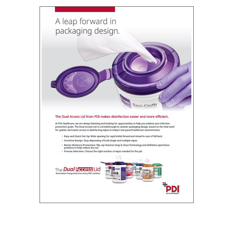 The Dual Access Lid is a breakthrough in canister packaging design, based on the vital need for quicker and easier access to disinfecting wipes in today’s fast-paced healthcare environments. We encourage you to learn more.